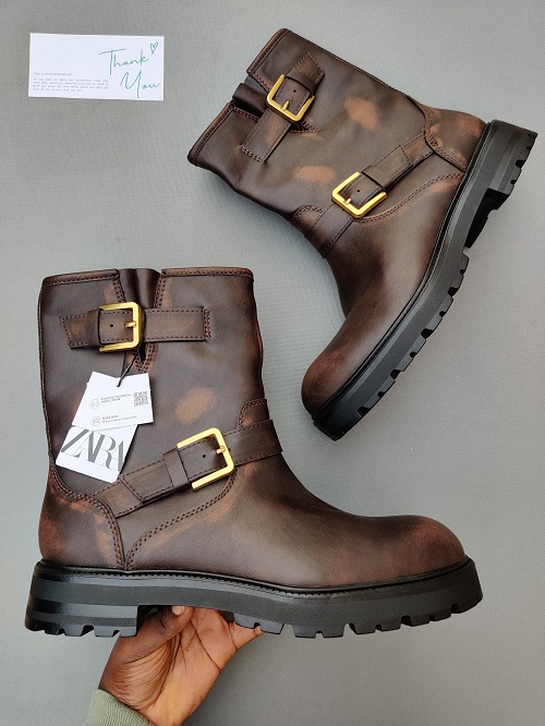 The Zara Brown Men's Boot with Buckles exudes rugged sophistication. Crafted from rich brown leather, it features bold bu...